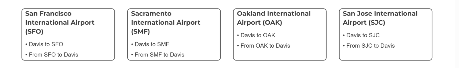 - • Davis Limousine Airport Transfer FROM: Sacramento Airport (SMF), San Francisco Airport (SFO), Oakland Airport (OAK), San Jose Airport (SJC)