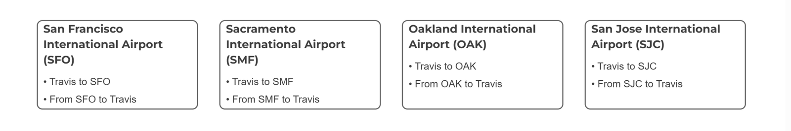 • • Travis Limousine Airport Transfer TO: Sacramento Airport (SMF), San Francisco Airport (SFO), Oakland Airport (OAK), San Jose Airport (SJC)